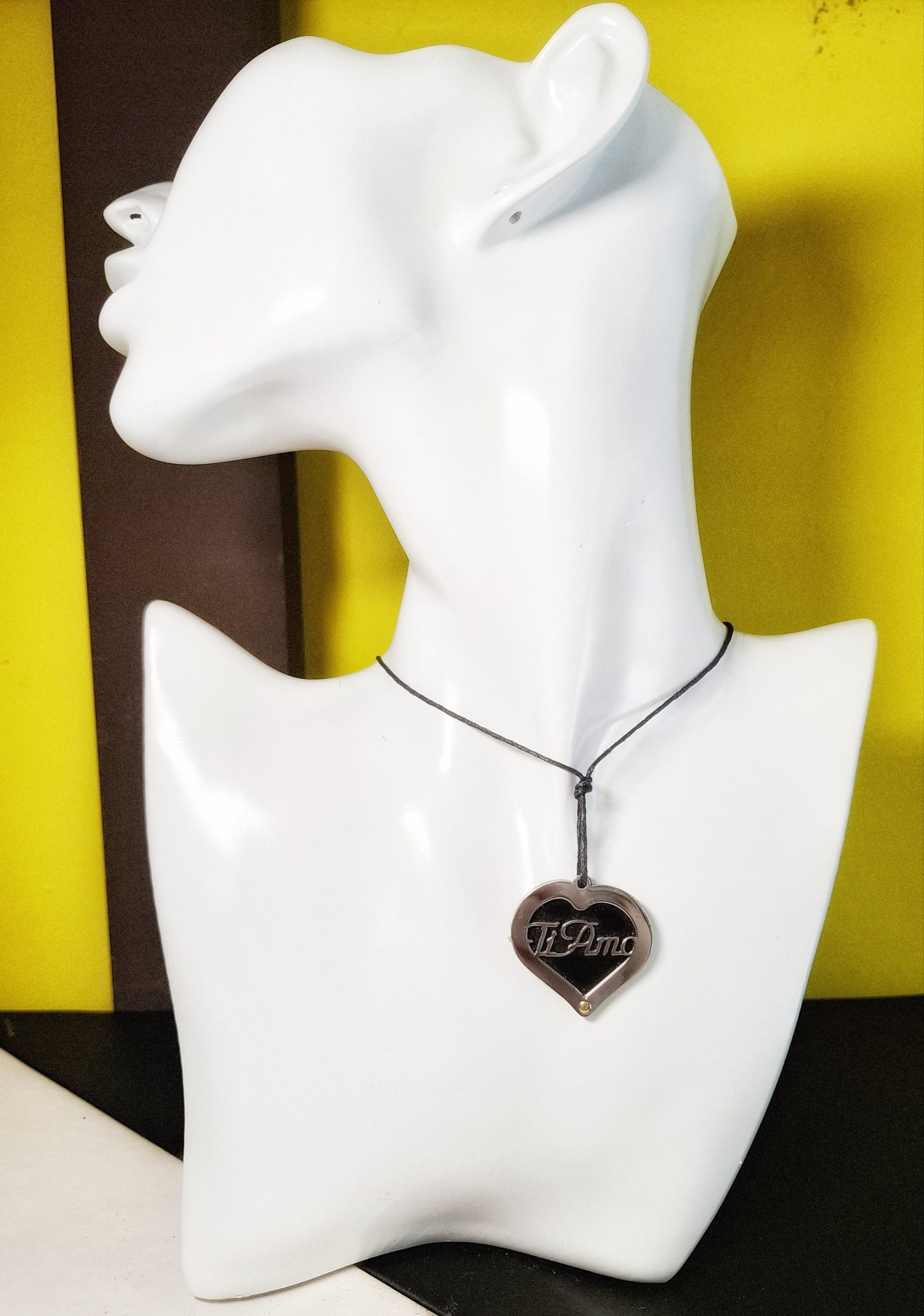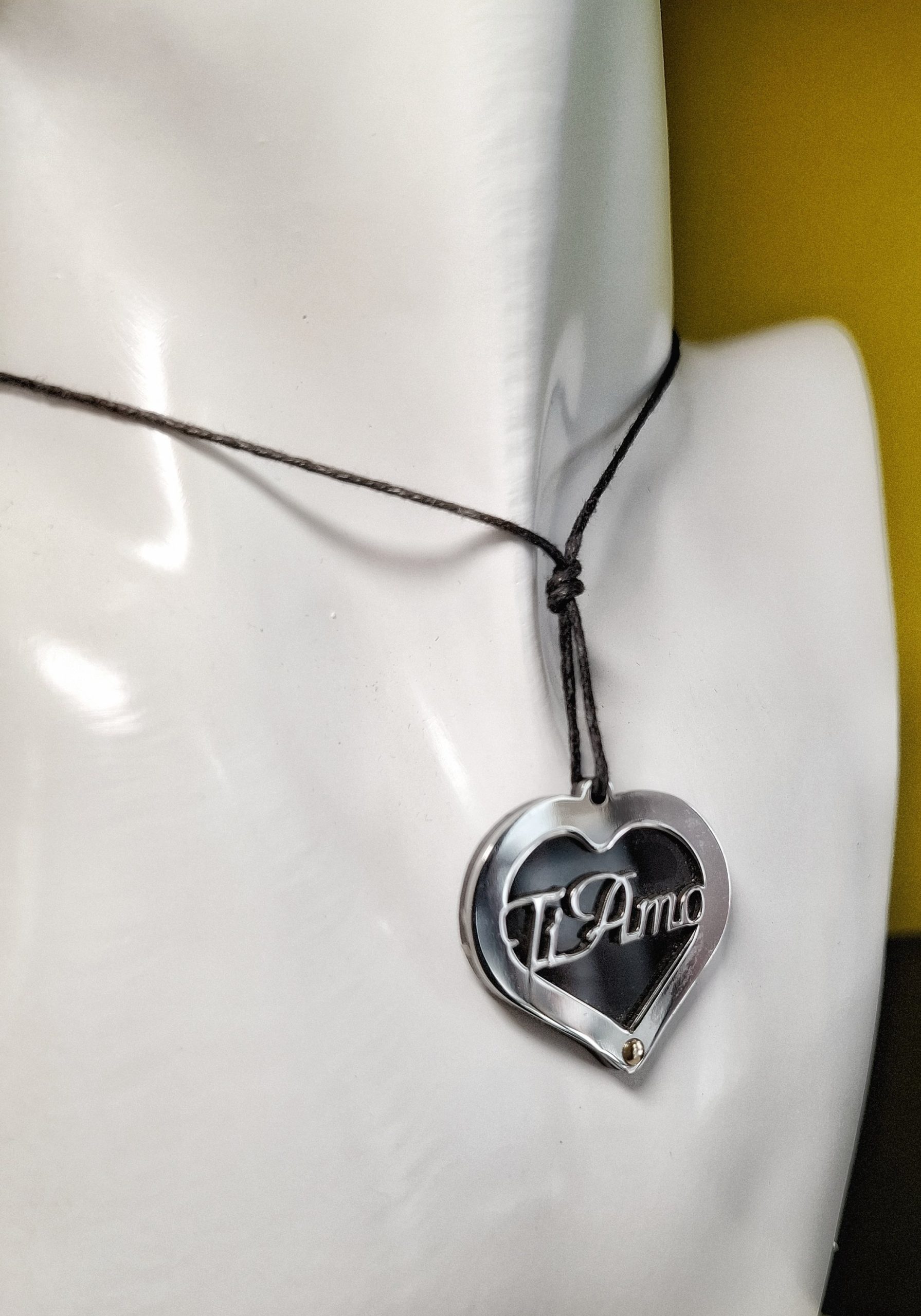 Ciondolo uomo in acciaio con inserto in oro. Base in pvc e cordino regolabile alla.lunghezza desiderata.