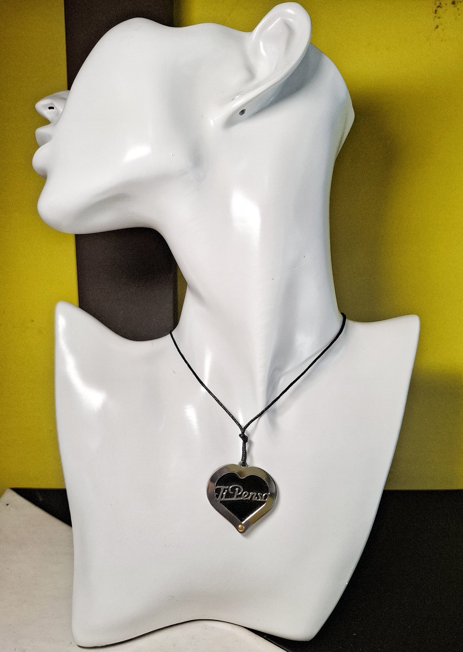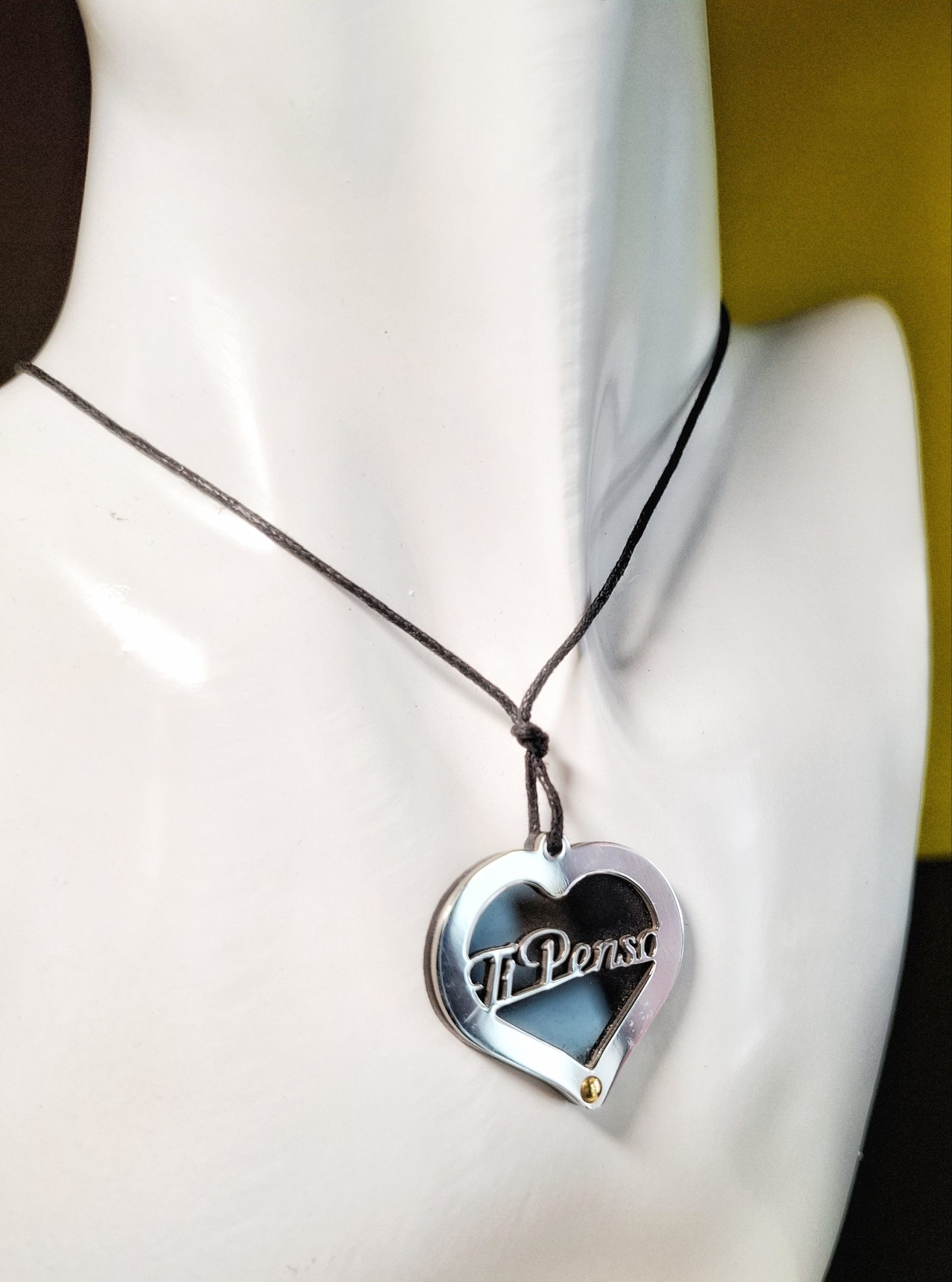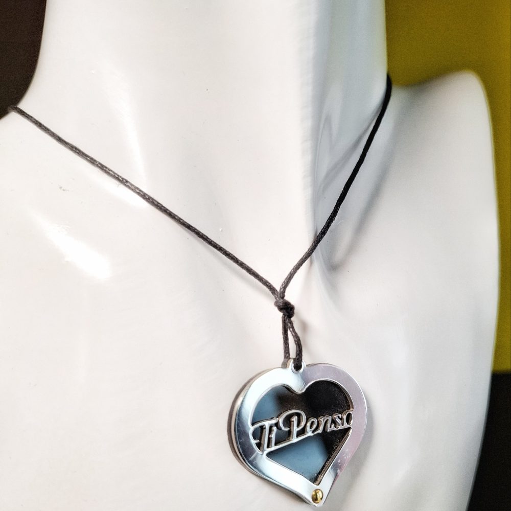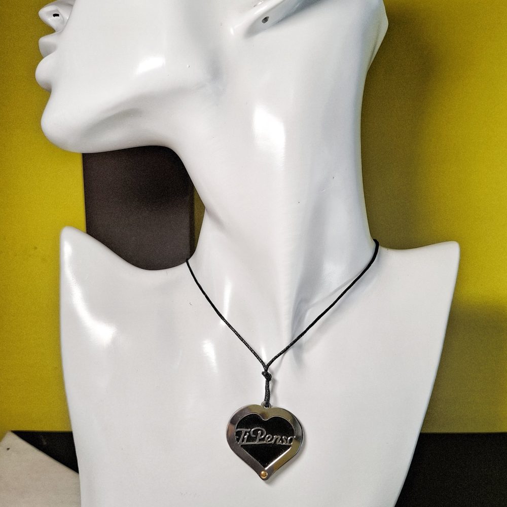 Collana in acciaio con inserto in oro e base in PVC. Cordino regolabile con nodi.