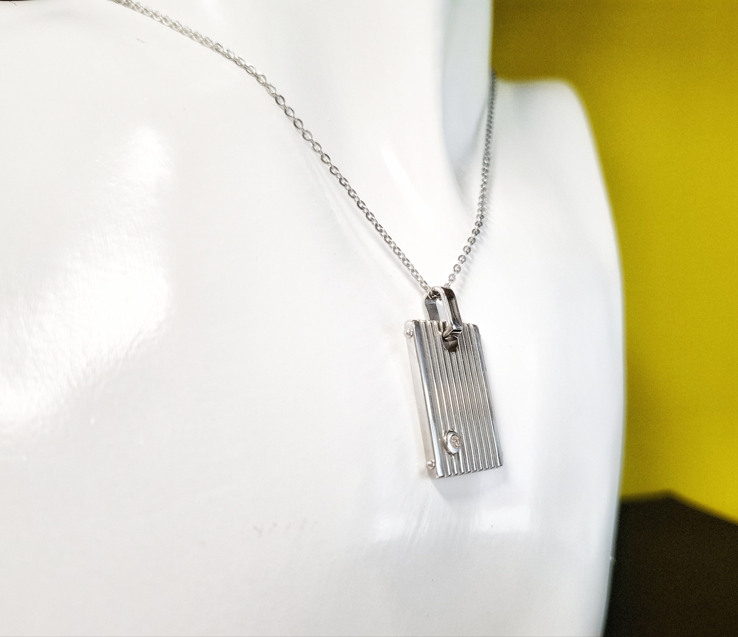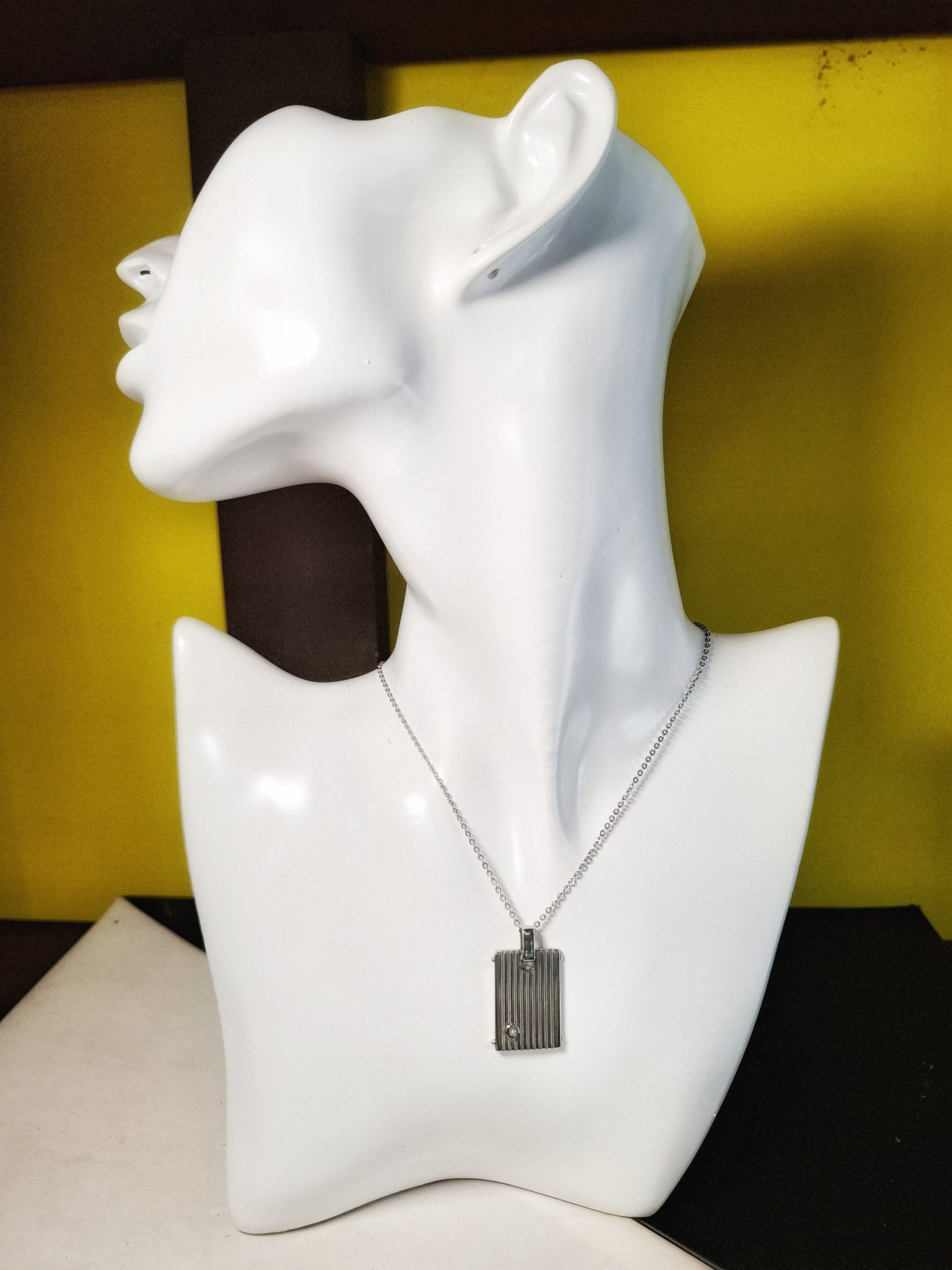 Collana uomo in acciaio con piastrina lavorata a righe impreziosita da un piccolo diamante.