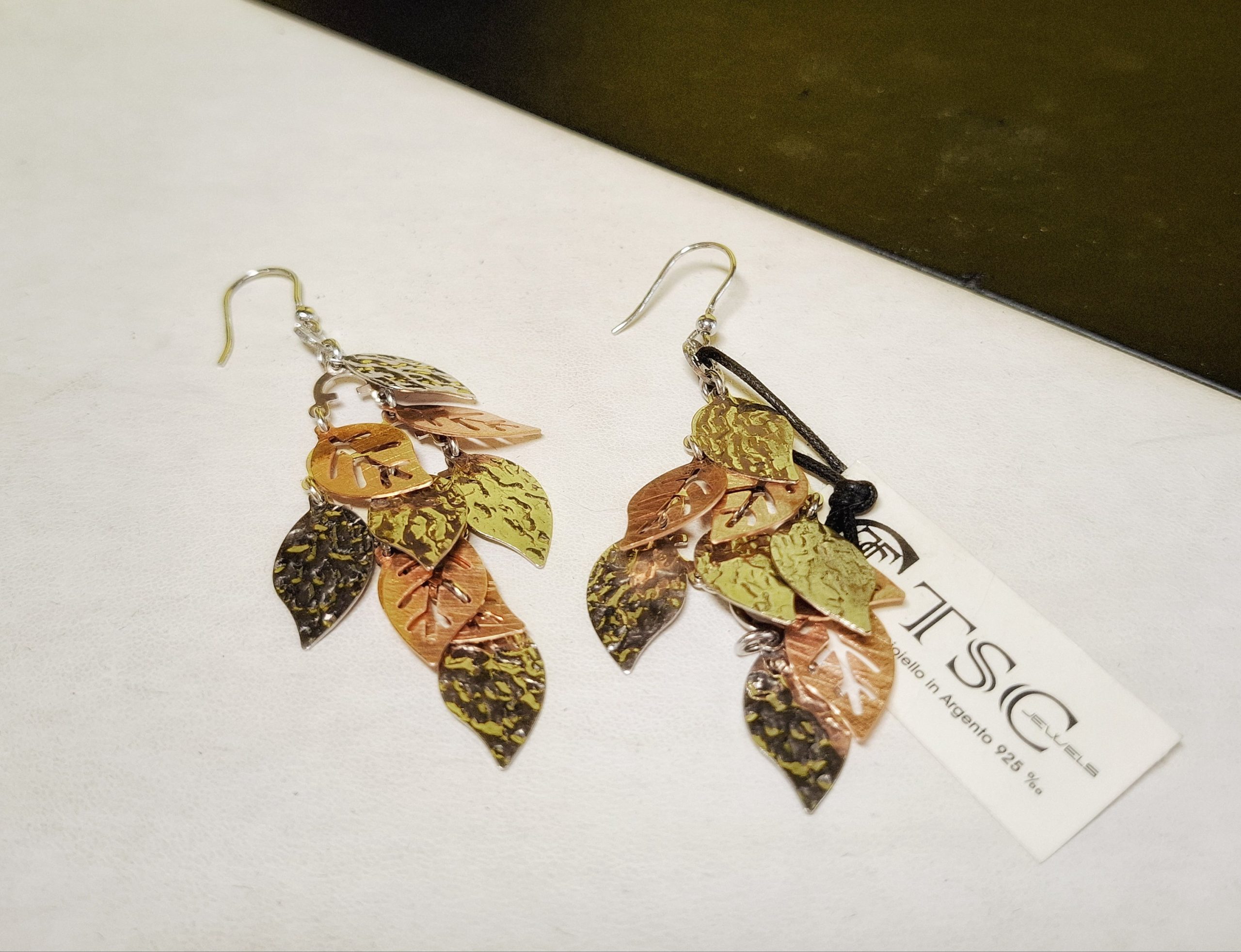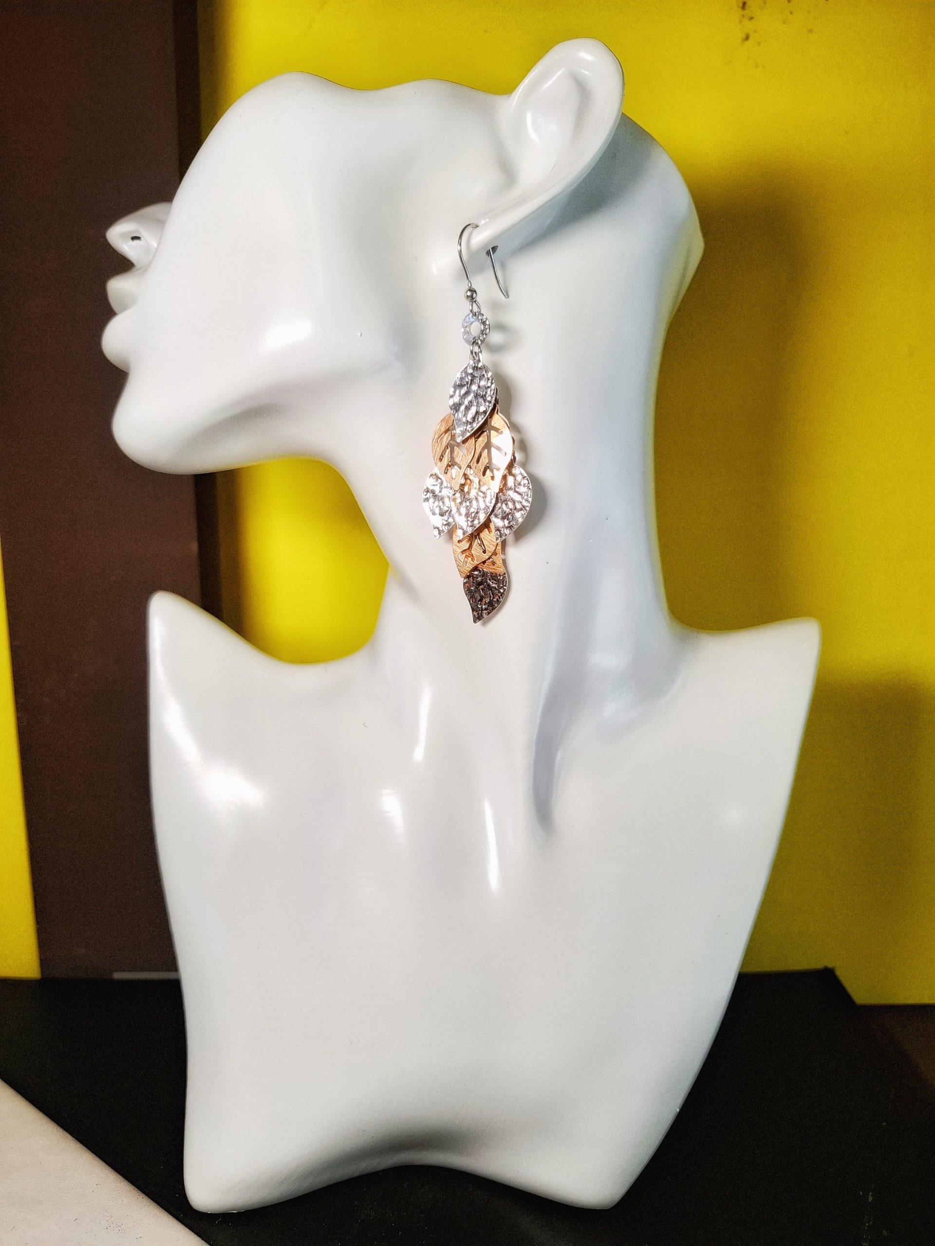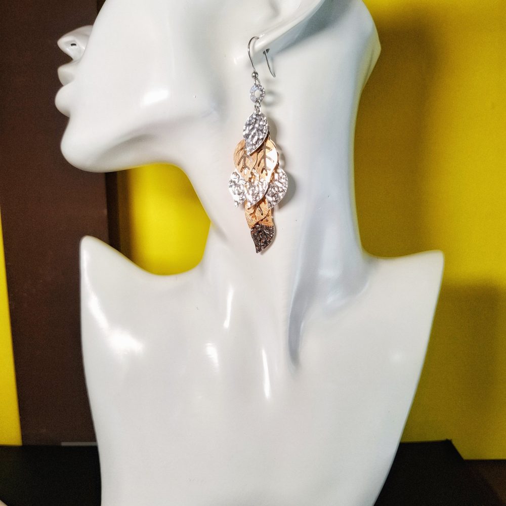 Orecchini pendenti in argento bicolore bianco/rosso. Lavorazione liscia e martellata. Chiusura a monachella aperta.