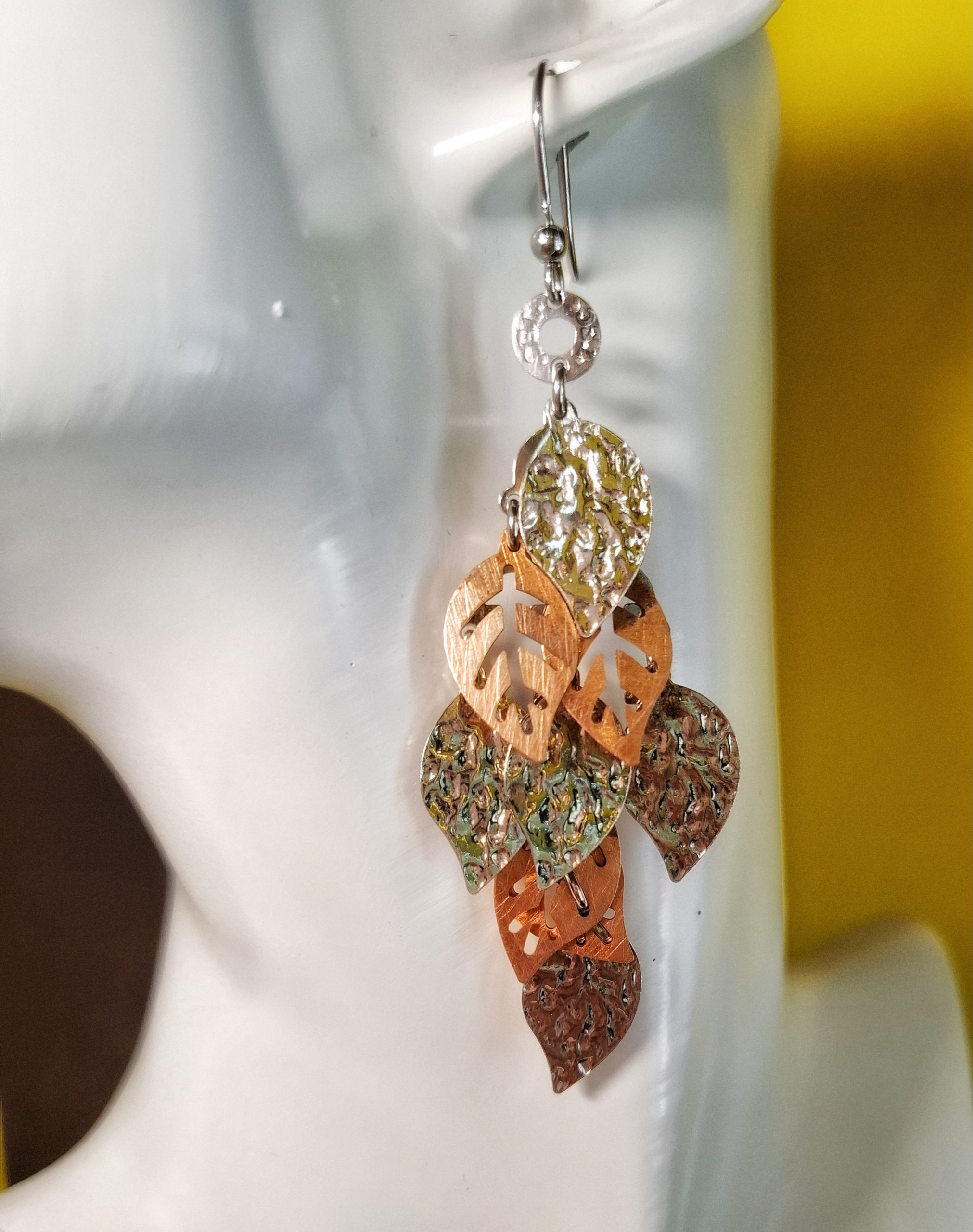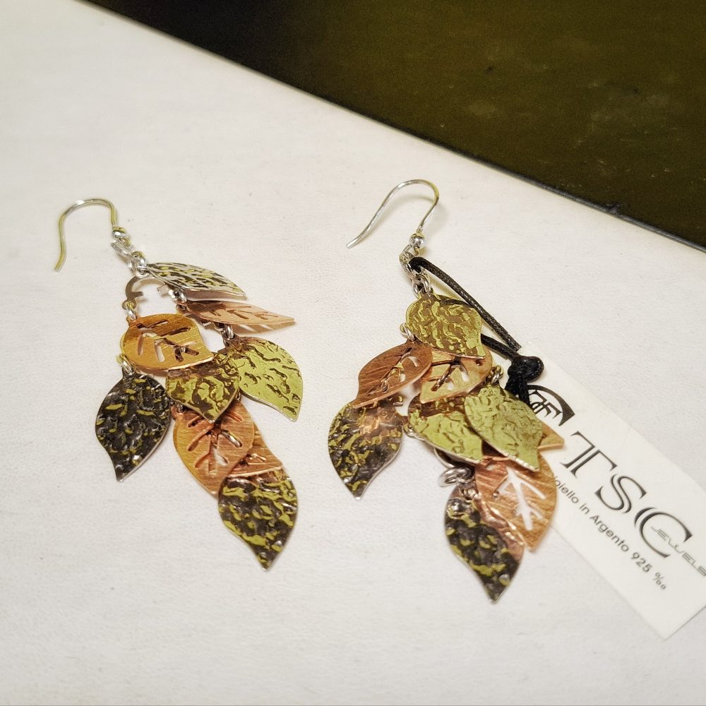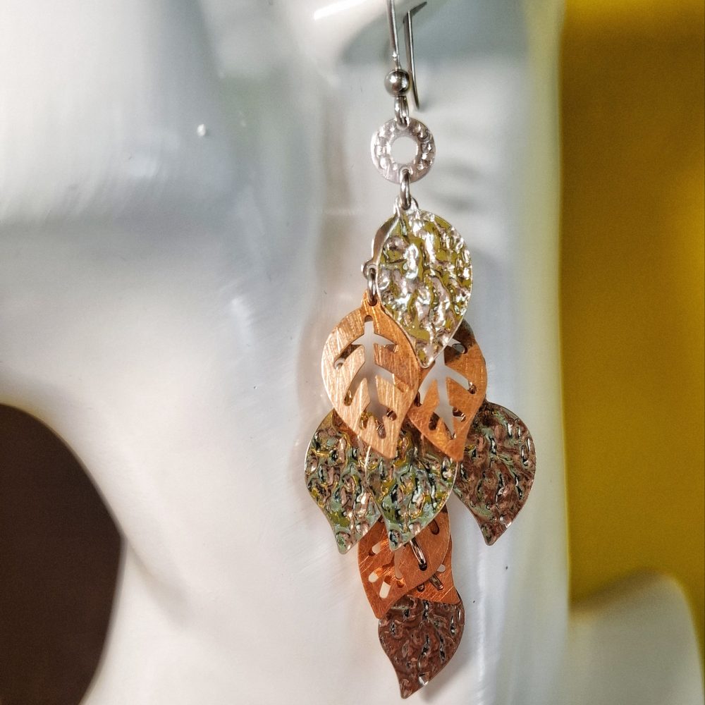 Orecchini pendenti in argento bicolore bianco/rosso. Lavorazione liscia e martellata. Chiusura a monachella aperta.